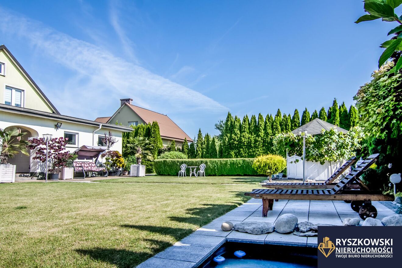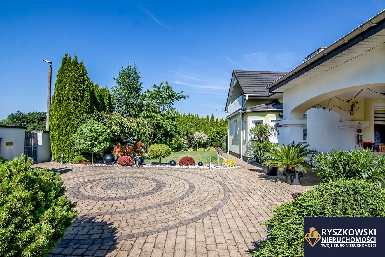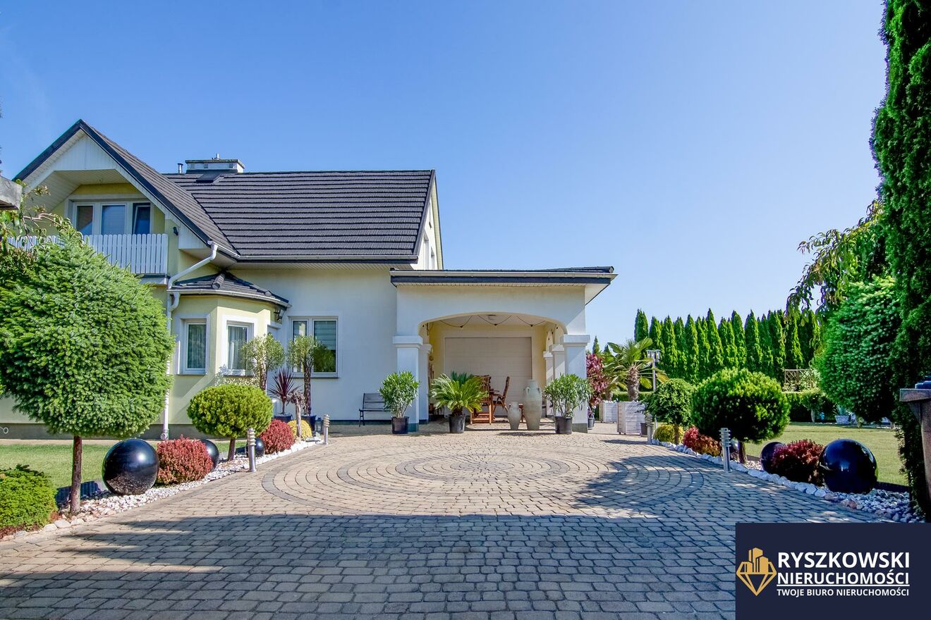 Nieruchomość składa się z równej, zadbanej i zagospodarowanej działki wraz z nasadzeniami o kształcie zbliżonym do prostokąta i wymiarach około 27 metrów szerokości i 47 metrów długości oraz łącznej powierzchni 1293 m2, na której posadowiony jest piętrowy dom całoroczny wraz z garażem w bryle budynku.