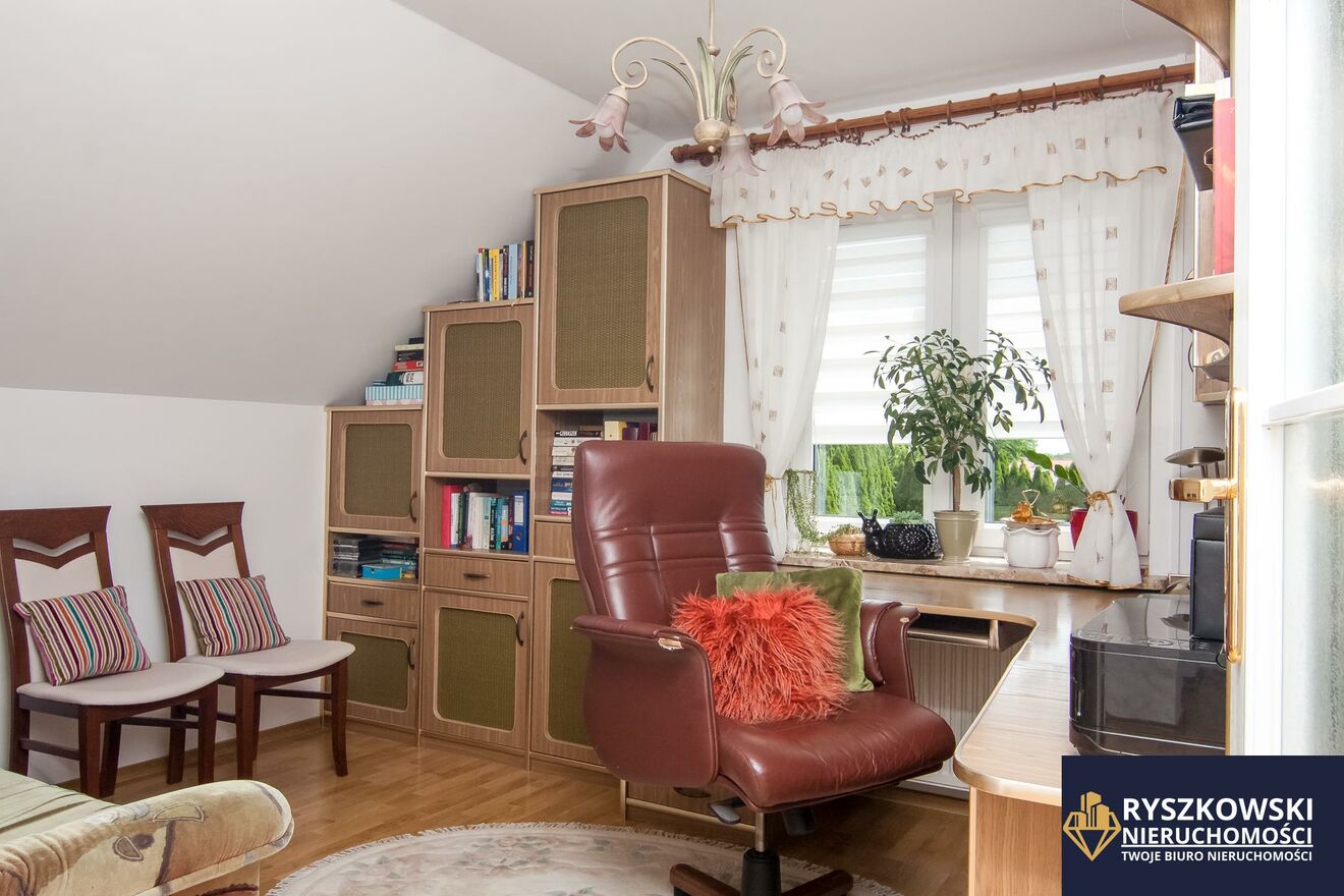 Budynek jest podpiwniczony oraz posiada przestronne poddasze użytkowe, na które składają się 3 niezależne pokoje/sypialnie, łazienka oraz garderoba. Na działce dodatkowo posadowiony jest blaszany garaż i altana.